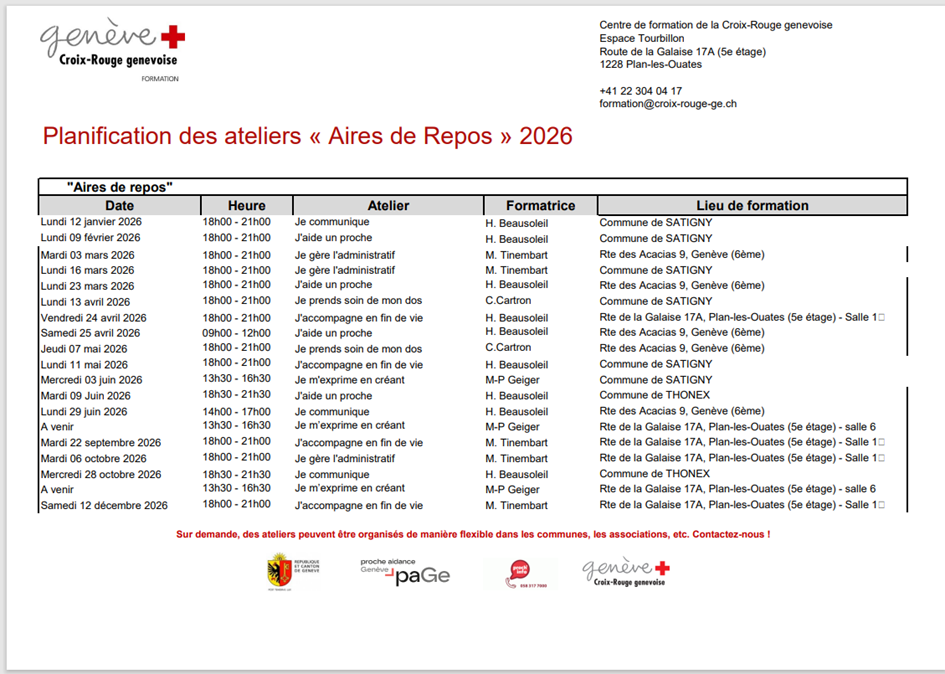 Pour plus d'informations, et vous inscrire à un atelier, envoyez un e-mail à formation@croix-rouge-ge.ch ou appelez le numéro suivant : +41 22 304 04 17.
